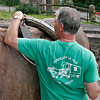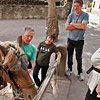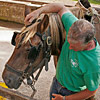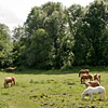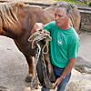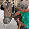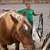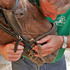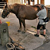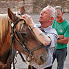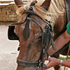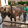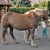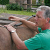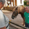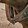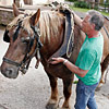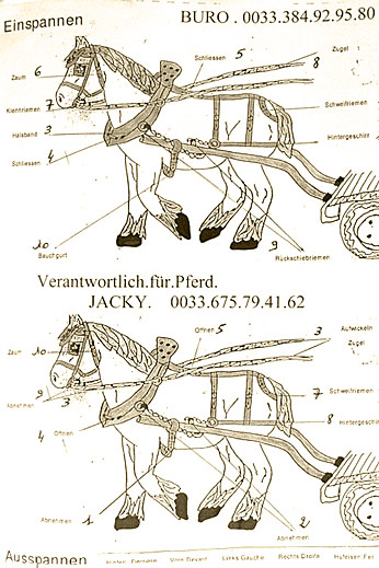 Die erste Bekanntschaft mit einem der famosen Pferde der Region machen wir mit KARLINE. Sie hat gerade ihre Fahr-Gäste von einer Wochenend-Tour zum Hof zurückgebracht. Eine siebenköpfige Familie mit Großeltern, Eltern, drei Kindern und deren Gepäck, hat sie in einem historischen, 1,1-Tonnen wiegenden Wagen, zwei Tage durch die wellige Landschaft bewegt. Die Tour-Anleitung schreibt zwar vor, dass bei starken Steigungen ALLE Teilnehmer, mit Ausnahme des Kutschers (der muss im Bedarfsfall auf dem Bock sein, weil nur dort gebremst werden kann!), absteigen und das Pferd durch Schieben des Wagens unterstützen sollen: KARLINE erreicht den Hof in Schweiß gebadet. Dennoch ist ihr Arbeitstag längst nicht zu Ende. Geduldig steht sie uns noch als Demonstrations- und Übungs-Model für das Auf-, Abschirren und das An- und Ausspannen zur Verfügung. Jacky, dem Mann für die „Roulottes“, die Pferdewagen und für deren „Bio-Motoren“ mit einer Ausnahme alles Comtois-Stuten gelingt es in seiner freundlich geduldigen Art, uns über unsere kümmerlichen Reste Jahrzehnte lang verschütteter Schul-Französisch-Kenntnisse hinweg zu zeigen, wie das fachgerecht zu geschehen hat. Zuerst wird das Hinter-Geschirr aufgelegt. Im Wesentlichen ein breiter, starker Lederriemen, der lose um das Hinterteil des Pferdes verläuft und dort durch mehrere kleine Riemen über die Kruppe (hinterer höchster Teil des Pferderückens) in Position gehalten wird. Beide Enden dieses Riemens sind in Fahrtrichtung mit Ketten verbunden, die beim Einspannen an den Gabelbäumen des Wagens eigehängt werden. Wir haben an dieser Stelle, bei unserem Lehrgang mit einer zweispännigen Kutsche, den sogenannten Schweifriemen kennen gelernt. Ein Schweifriemen liegt über dem Rückgrat des Pferdes und verbindet die vorderen Teile des Geschirrs mit der sogenannte Schweifmetze, einem geschlossenen Leder-Oval mit eingenähten Leinsamen. Die sind ölhaltig und damit selbstfettend. Ein äußerst pfiffiges Detail einer hoch entwickelten Technik aus der Prä-Hai-Tek-Zeit. Nachdem der Schweif des Pferdes so durch dieses Lederoval hindurch praktiziert wurde, dass es um die Schweifrübe (Verlängerung der Pferde-Wirbelsäule, an dem die Schweifhaare wachsen) zu liegen kommt, kann der Schweifriemen die übrigen Teile des Geschirrs daran hindern, nach vorn, auf den Kopf zu rutschen. Der Schweifriemen, den Jacky uns zeigt, ist Teil des Hinter-Geschirrs, endet jedoch y-förmig, also offen. Ein längeres rechtes Schlaufenteil kann so bequem unter die Schweifrübe gelegt und mit dem kürzeren linken Schnallenteil verbunden werden. Sehr praktisch. Nun kommt das Kummet, die „Kuppelung“ zwischen Pferdeleib und Wagen. In der traditionellen Form der Region Haute Saône präsentiert es sich als eine Art Collier, ein bestens durchdachtes Equipment aus der vor-otto-motorisierten Zeit. Ein Scharnier im Nackenbereich dieses äußerst stabilen, unsymmetrischen Ovals um den Hals des Pferdes ermöglicht ein Öffnen und Spreizen der beiden seitlichen Schenkel. Anders als geschlossene Kummets, die wir bisher kenngelernt haben, muss es nicht umgekehrt über den Kopf des Pferdes geschoben und gleich dahinter wieder zurück gedreht werden. Dadurch, dass es unten zu öffnen ist, kann man es, links neben dem Pferd stehend, von hinten über den Widerrist (höchste Stelle des Pferdes am Übergang von der Brust- zur Hals-Wirbelsäule) nach vorn um den Hals des Pferdes schieben. Bei dem kapitalen Gewicht dieses rustikalen Geschirrteils mit Eisenkern, eine wahrlich menschenfreundliche Technik! Ein in zwei/drei Stufen weitenverstellbarer Metall-Verschluss, mit einer verblüffend einfachen, kleinen Leder-Zungen-Sicherung unter dem Hals des Pferdes, ermöglichen das Fixieren und Justieren dieses integralen Bestandteils eines Zugpferde-Geschirrs an ein sich eventuell veränderndes Halsvolumen. Die möglichst vollkommene, individuelle Passform eines Kummets ist nämlich entscheidend für eine optimale Kraftübertragung vom Pferd auf den Wagen und damit auch für ein möglichst pferdeschonendes Fahren (Achenbach). Entsprechend besitzt hier jedes Roulotte-Pferd sein eigenes, maßgeschneidertes Kummet. Schweifriemen inklusive Hinter-Geschirr werden durch die Schlaufe eines Riemens über dem Pferderücken mit einer Schnalle, hinten oben am Kummet, verbunden. So kann das Kummet bei gesenktem Kopf des Pferdes nicht auf diesen herabrutschen = Schreck- und Verletzungs-Gefahr für das Pferd sind gebannt - ! so lange diese Verbindung zum angelegten Hintergeschirr besteht ! Zum Abschluss des Aufschirrens kommt das Zaumzeug. Es wird über das Weidehalfter angelegt, das zum Anbringen des Führstrickes dient und das die Pferde hier den ganzen Sommer über tragen, da sie in dieser Zeit nicht in den Stall kommen. Das Zaumzeug eines Zugpferdes besteht aus Kopfgestell, Kandare und der Leine. Als Kopfgestell bezeichnet man ein Halfter mit Kandare. Eine Kandare ist eine Trense (Eisenstange, quer durch die große Zahnlücke im Pferdemaul, direkt hinter den Schneidezähnen) an der außerhalb des Mauls, rechwinklig dazu, Hebel („Bäume“) mit Anbinde-Möglichkeiten für die Leinenenden und eine Kinnkette angebracht sind. Die Kinnkette wird ums Kinn herum an der gegenüber liegenden Seite der Kandare eingehängt und funktioniert als ein Widerlager für die Einwirkung der Leine auf das Pferdemaul. Zweites Widerlager ist der Nasenriemen des Kopfgestells. Die beiden Enden der Leinen werden rechts und links von hinten durch bewegliche Metallringe (Leinen-Augen) an beiden Seiten des Kummets gezogen und dann in den oberen Ringen der Kandare eingehängt. Nachdem der hintere Teil der Leine durch eine Lederschlaufe auf dem Hinter-Geschirr geführt wurde, wird sie bis zum Start unter demselben in Schlaufen abgelegt. Die Leinen bestehen hier aus einem rustikalen Hanfstrick, wie dies wohl traditionell bei bäuerlicher Anspannung üblich war/ist. Für einen Kurzzeit-Kutscher und seine Alabaster-Hände bedeu