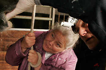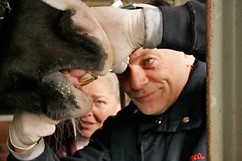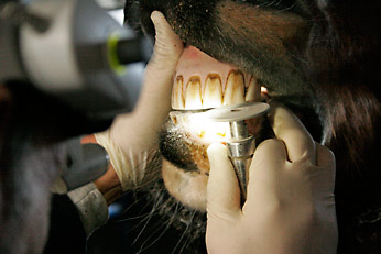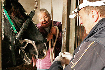 Pferde-Zahn-Behandlung Dr. Langel sorgt für eine gute Funktion im Zellulose-Mahlwerk Breitscheid, 19. Dezember 2012 Zu den Bildern von Jaron / von Jankid Was man nicht so alles lernt, wenn man mit Pferden zu tun hat: Wer in Deutschland glaubt, es sei eine gute Idee, sich ungestraft "Pferde-Zahnarzt" zu nennen, der liegt ebenso schief, wie der, der meint einen anderen so nennen zu dürfen. Weil es im Studiengang zum Tiermediziner kein Fach "Pferde-Zahn-Medizin" gibt, ist der Name "Zahnarzt" den Zahn-Medizinern in der Human-Medizin vorbehalten. Ein Zahnarzt, der sich so nennen darf, ist also ausschließlich ein Menschen-Zahnarzt. Wer dennoch seine Bemühungen um das Wohl und die Gesundheit von Pferdezähnen anbieten möchte, der darf das völlig straffrei unter der Bezeichnung "Pferde-Zahn-Behandlung" tun. Und seit es keine Ausbildung mehr zum Dentisten gibt, ist auch der Titel "Pferde-Dentist" nicht mehr geschützt. Jeder darf sich so nennen, allerdings auch die Tätigkeit ausüben, von der er persönlich meint, dass sie dazu passe. Wer auf einen gewissen Ausbildungs-Standard Wert legt und dies auch seinen potenziellen Kunden signalisieren will, der macht z.B. eine Ausbildung und legt eine Prüfung nach der Prüfungsordnung der IGFP ("Internationale Gesellschaft zur Funktionsverbesserung der Pferdezähne e.V.") und vor von diesem Verein autorisierten Prüfern ab. Er darf dann den geschützten Titel "Pferde-Dental-Praktiker", "PDP nach IGFP" führen. Wer jedoch Arbeiten am stehend sedierten Pferd vornehmen will, und nur so sind die wichtigsten Behandlungen am Pferdegebiss möglich, der braucht dazu, auch als PDP, einen Tierarzt. Nur Tierärzte dürfen nämlich eine "Stand-Sedation" durchführen. Dabei wird dem Pferd ein Sedativum gespritzt, wonach es derart beruhigt ist, dass es heftigste Schleifarbeiten an seinem Gebiss erträgt, ohne in Panik zu geraten, wonach es dennoch so "wach" bleibt, dass sein Steh-Reflex funktioniert, dass es sich also nicht schlafend zu Boden legt. Sedierung ist keine Narkose. Die Sedierung nimmt dem Pferd die Angst und hebt den Fluchtinstinkt weitest gehend auf. Dadurch wird eine sichere und gründliche Diagnostik ("wissender" Blick) im Maulraum und in der Folge ein sichereres, schnelleres und gründlicheres Arbeiten bei geringerem Verletzungs-Risiko für alle Beteiligten möglich. Die Menge des zu verabreichenden Sedierungs-Mittels hängt ab vom Körpergewicht des Pferdes und von der geschätzten Dauer der Behandlung. Da das Sedations-Mittel eine gewisse Zeit im Körper des Pferdes nachzuweisen ist und da es auf der Doping-Liste steht, sind Zahnbehandlungen für Sport- und Schlachtpferde entsprechend zu terminieren (Karenzzeiten). Da wir all das (natürlich nicht) wussten und da es für unsere beiden rüstigen Sport-Veteranen ohnehin von keinerlei Wettkampf- oder gar Salami-Bedeutung ist, haben wir uns, wie im letzten Jahr, vertrauensvoll an den Termin gehängt, den Jutta für den Saalbach Hof mit Dr. Langel aus Hadamar, für Mittwoch, 19. Dezember 2012, gemacht hatte und ihn damit zum zweiten Mal mit der Pflege der Mahlwerke unserer Beiden betraut. Immerhin ist er Tierarzt, darf also sedieren, und er bietet Pferde-Zahn-Behandlung an. Im letzten Jahr lag ich zum entsprechenden Termin im Krankenhaus, kenne das Geschehen also "nur" aus Elkes Schilderungen. Schon ihre Bewunderung für die Sicherheit, mit der Dr. Langel das Gewicht unserer Beiden so zutreffend geschätzt hatte, dass die entsprechend gespritzte Menge des Sedativums exakt für die geplante Zeit der Behandlung wirksam war, konnte ich bei diesem Termin absolut nachvollziehen. Nachdem Dr. Langel dem Patienten das Beruhigungs-Mittel per Spritze in den Hals verabreicht hat, wirkt es bei einigen überraschend unmittelbar: Der Kopf senkt sich, das ganze Tier steht mit breiten Vorderbeinen in Schlaf-Modus. Den schweren Kopf nimmt nun am Unterkiefer ein großer gepolsterten Ring auf, der mit einem Riemen wie ein Halfter im Nacken verschnallt wird. Mit einem Strick über den Boxen-Tür-Rahmen gezogen, wird dieses Ensemble nun von Elke in jeweils gewünschter Höhe fest gehalten. Nun wird dem Patienten ein Maulgatter (Speculum) verpasst und ebenfalls im Nacken "verankert". Ein Stück Edelstahl-"Häwwi-Mättl", mit dem das Pferdemaul offen gehalten wird. Damit kann an allen Zähnen gearbeitet werden, außer den zwei mal sechs Schneidezähnen, gegen die sich die beiden Platten an den Hebel-Enden des Maulgatters abstützen. Nun kann Dr. Langel, mit einer Kopflampe ausgerüstet, den geöffneten Maulraum inspizieren und seine Diagnose erstellen. Danach folgt dann das, was eine Sedierung auf jeden Fall notwendig macht: Der Einsatz einer elektrischen Schleifmaschine (Fräse). Dieses Gerät besteht aus einem Metall-Griff, an dessen vorderem Ende sich rechtwinklig zu seiner Längs-Achse ein wg. Schleimhaut-Schutz eingefasster, Diamant besetzter, kreisförmiger Raspelkopf befindet. Dieser wird über eine flexible Welle von einem Elektro-Motor angetrieben und mittels eines Fußpedals gesteuert. So werden die Kau-Flächen der Backenzähne an Ober- und Unterkiefer passgenau planiert und von scharfen Kanten und Haken befreit. Stufen von einem zum benachbarten Zahn können, wenn sie besonders hoch sind, nicht in einer Behandlung ausgeglichen werden. Wie etwa bei Jaron im letzten Jahr. Nach der diesjährigen Behandlung müssten seine hinteren Mahlwerke nun (wieder?) optimal funktionieren. Der Eindruck, den er Tage später macht, spricht sehr dafür: Ein genüsslich und zügig kauender kleiner Gelderländer, der früher für seine "Mäkeligkeit" beim Fressen berühmt war. Jankid, der bis heute, leer kauend, knapsende Geräusche erzeugte, tut dies nun nicht mehr. Dafür kaut er auffällig verhalten, fast meditierend, so als traue er irgend einem "Braten" noch nicht so recht. Ursache scheint aber keine Fehlfunktion zu sein, eher wohl ein noch ungewohntes Gefühl. Nach mehrmaligem Spülen mittels einer Klistier ähnlichen Riesen-