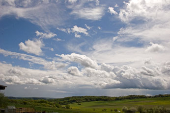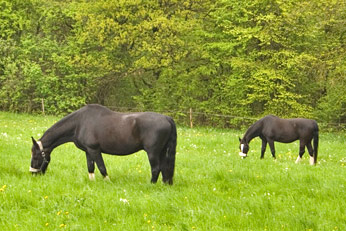 8. Mai 2013 Der Himmel im Mai über dem Erdbachtal Wolken ziehen wie gemalt über grünendes Land und in glasklarer Luft liegen schon die Eisheiligen vom kommenden Samstag, 11. bis Mittwoch, 15. Mai. ### 10. Mai 2013 Jaron und Jankid verlassen die Winterweide Seit 17. November war der satte Hektar mit dem östlich angrenzendem Steinbruchswall, der nördlich für ottomotorisierte Unterhaltung sorgenden Medenbacherstraße, ihren westlich nachbarlich grasenden Kumpeln Fango und Lugh (die schon ein paar Tage früher umgezogen sind) und mit, von Süden ab und zu schwarzkitteligen Begegnungen, häufiger sogar mit bis zu vier Rehen inklusive eines behörnten Bockes, Jaron und Jankids täglicher Lebens-, Bewegungs- und Heuknabberraum, der in diesem Jahr ein Anweiden überflüssig machte, weil das erste Grün mit derart schonenden Zuwachsraten erschien, dass auch in neun Stunden keine Mengen davon eingesammelt werden konnten, die den empfindlichen Pferde-Verdauungstrakt hätten überfordern können. (Was'nSatz) Ihre neue Weide, die sie mit offensichtlichem Vergnügen noch für einen Tag barfuß unter die Hufe nahmen - am Samstag verpasste Kai ihnen wieder Eisen - ist die #3 vom letzten Jahr, südlich am Erlenweg mit den zwei Apfelbäumen. Zu größeren Bildern geht es über die kleinen. zurück zu: Pferde |