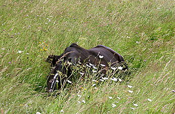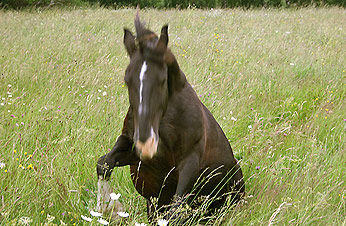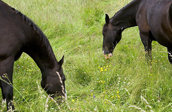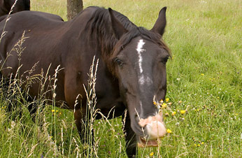 Jaron und Jankid genießen ihre dritte Weide 2013 ### Erwartungsgemäß reichte das Grasangebot der kleinen, aber besonders wg. Sonnen- und Windschutz feinen Weide #2 gerade mal knapp zwei Wochen. Immerhin nutzten es unsere Beiden in diesem Jahr rund um die Uhr; Bis auf die letzte Weide von 2012 waren sie ja noch "Heimschläfer" in ihren Boxen auf dem Saalbachhof mit täglich abendlicher Heuration. Die letzten Tage wurde der Grasrand unter der Litze entlang dem Erlenweg an Weide #1 per Sense und Seat-Kofferraum auf Weide #2 verbracht. Werner hatte dann ein Einsehen mit Seniorenmuskel- und Skelettapparaten und brachte den Wasserwagen von eben dort zum nördlichen Rand der Weide #1 am Siegweg. So war das Koppel-Abendbrot am Montag, 24. Juni 2013 der Umzugstermin zur ca. einen halben Hektar großen neuen, Jaron und Jankids erster Weide in Breitscheid, nur hundert Meter weiter östlich am Siegweg, nördlich am Erlenweg. Bei pferdefreundlichem frischen, ab und zu leicht nieselregnerischem Wetter nahmen unsere beiden lieben alten Gelderländer ihr neues Pferde-El-Dorado unter ihre Hufe. Jankid wickelt genüsslich Grasblüten in sein sensibles Mahlwerk, und nun... ...macht er den Eindruck, als habe ihm schon lange keine Weide mehr so gut gelegen Die Nahrungsaufnahme in der Horizontalen ist zwar für einen Freund der Esskultur wie ihn nicht auch nur das kleinste Problem, aber... ...mit einem Bruder und Boss namens Jaron muss man stets sehen, wo man bleibt, ernährungs-, kommunikationsmäßig - und so! Am nächsten Morgen zeigen sich die Beiden noch etwas leicht schreckhaft, immerhin neue Dimensionen, neue Laufwege, neue Geräuschkulissen... wollen erst einmal im rigorosen Sicherheitskonzept der Marke Pferd integriert sein. Auf die nächsten sechs Wochen - mindestens. |