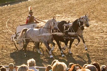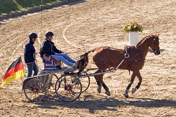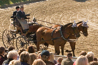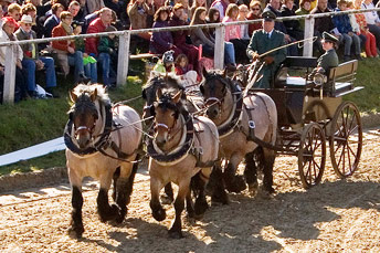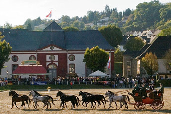 Hengstparade am Hessischen Landgestüt Dillenburg, 29. September 2013 Wenn gutes Wetter die sprichwörtliche halbe Miete jeder Freiluft Veranstaltung ist, dann hat der Gott der Pferde den Mitstreitern des Hessischen Landgestüts Dillenburg an den letzten beiden Sonntagen im September 2013 ein volles Pfund für die Sache unserer wunderbaren vierbeinigen Mitgeschöpfe beschert. Was für'n Satz. Tollstes Pferdewetter, frischer Ostwind, trotz hellem Sonnenschein keine terroristischen Insekten. Uns beiden bescherte dies auf der Osttribüne, trotz täglich open-air-gewöhnter Haut, einen prächtigen linksseitigen Kopfsonnenbrand. Selber Schuld: Von Kutschen-Führerschein-Besitzern*) sollte man ja eigentlich einen Hut zur stil- und funktionsgerechten Garderobe erwarten! Oder? *) Hast ja recht, Thommi, korrekt heißt es: Deutsches Fahrabzeichen der Klasse vier (DFA IV) der Deutschen Reiterlichen Vereinigung (FN = Fédération Equestre Nationale) - sowas nennt man wohl Bezeichnungs-Quark?! Dem Wetter entsprechend ist auf den Zuschauerrängen des Paradeplatzes schon kurz nach zwölf volles Haus. Wären wir doch so klug gewesen und den Zeichen eines Mitarbeiters des Gestüts an der Abbiegespur von der Frankfurter- zur Jahnstraße gefolgt, rechts abgebogen und hätten einen Parkplatz in Richtung Bahnhof gesucht. Eigensinnig bogen wir trotzdem links ab, und so fand sich denn ein regelgerechter Parkplatz erst an der Berliner Straße, auf halbem Wege nach Niederscheld. Auf diese Weise rächt sich übrigens bis heute der einst bescheiden überlegte Verkauf der Weiden des Landgestüts in doppelter Hinsicht: Den Hengsten, Vererbern gewünschter edelster Merkmale, fehlt seit dem der artgerechte Auslauf und/oder eine gestütseigene Quelle von Raufutter kontrollierter Qualität. Auch wenn Fachleute(?) für, in ihren Augen offenbar nur wandelnde Spermien-Automaten regelmäßiges grasendes Hufevertreten als verzichbar erachten, mir redet kein "Experte" aus, dass die Lebensbedingungen eines Hengstes auch und gerade außerhalb seiner vier Boxen-Wände Einfluss haben auf die Qualität seiner Vererber-Eigenschaften. Und, wenn denn schon die Nutzbarkeit dieses Graslandes für Gestüts-Pferde für verzichtbar gehalten wurde, dann fehlt immer noch, zu mindestens für einen Teil davon, die Nutzung als Abstellmöglichkeit für ottomotorisierte Ölkutschen. Nicht nur bei gut besuchten Veranstaltungen wie dieser, wären ausreichende Parkplätze, speziell auch in seniorengerechter Erreichbarkeit, Nerven-Schoner für Ottomotoren-Ritter wie für anwohnende Dillen-Bürger. Zum Programm und seiner Präsentation: Was die Berücksichtigung der Vielfalt des Lebens von Menschen mit Pferden angeht (historische Facetten aus Militär und Landwirtschaft, Sport- und Freizeitpferd heute), liebevolle Professionalität (keine Panik, wenn mal etwas schief geht, ist ja "nur" ein Mensch, seltenst ein Pferd "schuld"), Abfolge der Darbietungen: Timing ("Unentschieden" zwischen hektischer Hudelei und Langatmigkeit) und Dynamik (Würdigung und Gegenüberstellung von groß/klein, langsam/schnell, viele/wenige, laut/leise, Pausen/Höhepunkte, Steigerung/Ausklingen!), Beschallung (professionell, state-of-the-art, bis auf ein paar Bedienungs-Kracher), Musikauswahl (seriös, frei von Ballermann-Peinlichkeiten, vom klassischen Pferde-wat-mutt-dat-mutt bis zu erträglichen Kompromissen mit Kommerz-bumm-bumm) und was schließlich eine kompetent informierende wie emotional mitnehmende Ansage angeht, können wir ganz einfach sagen: Es hat uns (nun zum zweitenmal) sehr gut gefallen. Für stolze 20 Euro (vor Ort der Gegenwert(?) von sechs, 2/3 Würstchen, im leider zeitgemäßen Papp"brötchen") fühlten wir uns dennoch bestens unterhalten. Auch wenn die fehlenden Anlehnungs-Hilfen der historischen wie spartanischen Sitzbänke unseren Wirbelsäulen einiges abverlangten. Zumal die, mit ihrer (Rest?-) Bemuskelung, besonders im Lendenbereich, doch schon etwas in die Tage gekommen sind. Am schönsten war für uns, dass allen Mitstreitern dieser gelungenen Veranstaltung die Freude an ihrem Tun ins Gesicht geschrieben stand. Selbst von unserer letzten Sitzreihe aus war dies deutlich zu erkennen. Dennoch werden wir beim nächstenmal versuchen, wieder so rechtzeitig da zu sein, dass wir einen Platz so nah wie möglich am Sandgeviert ergattern können. Erst bei der Betrachtung der Bilder - eingefangener Augen-Blicke - wurde uns nicht zum erstenmal klar, dass es der Ausdruck von Gesichtern ist, besonders der Augen, die das in Vertrauen zu ihren Menschen gebettete Temperament der Pferde, die Freude und Begeisterung der Menschen am Leben mit ihnen und für sie wiederspiegeln und auf den Betrachter überspringen lassen. Als eine selten gelungene Würdigung dieses ganz besonderen Verhältnisses zwischen Tier und Mensch berührte mich (Karlheinz) die Feier eines einzelnen, dieses, am langen Zügel geführten Pferdes, durch das Abspielen einer "persönlichen Melodie". Wunderbar! Wir sagen allen, die uns diesen schönen Nachmittag geschenkt haben, Tier und Mensch: Ein ganz großes DANKESCHÖN! Wir freuen uns schon heute, Montag, den 30. September 2013, auf die nächste Hengstparade am Hessischen Landgestüt in Dillenburg im Jahr 2015. Elke und Karlheinz ### |
