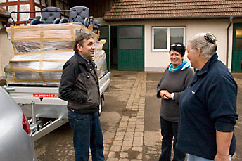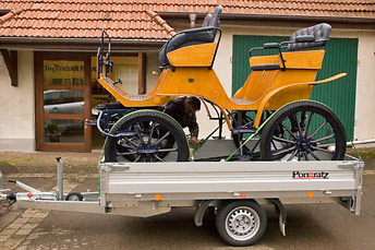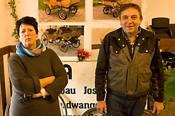 Dienstag, 8. Oktober DIE SAWA kommt zum Hohen Westerwald (I) Heisterberg - Herdwangen. Etwas überrascht dreinschauende Pferde nehmen ungewohnt früh, dennoch sichtlich einverstanden, schon um halb acht am Dienstag, 8. Oktober 2013, ihr Morgenmüsli auf der Weide in Empfang. Frühstück für die Hofkater Socke und Max am Saalbachhof und ein ganz schwerer Abschied von Pompi, unserer kleinen, sterbenskranken Herzenskatze. Dem Geschenk, sie erleben zu dürfen, wollen wir unsere neue Kutsche widmen, die Pompi-Sawa. Nachdem ein freundlicher, junger Mitarbeiter des Autohauses METZ in Gusternhain die elektrische Verbindung zwischen unserem SEAT ALTEA und dem funkelnageneuen PONGRATZ hergestellt hatte - eine zu fummelig enge Angelegenheit für zwei betagte Hänger-Fahrer-Novizen - konnte um 8.30 h unsere Fahrt zur Firma SAWA in Herdwangen am Bodensee beginnen. Der Führung des Navis folgend, das uns Peter geliehen hatte ("märßi bjeng!"), kamen wir problemlos bis hinter Stuttgart und bis seltsam klappernde Geräusche aus unserem Hinterteil Schlimmstes befürchten ließen: Reifen platt? ADAC-Hilfe?... Mit durchschnittlich 90 hatte ich die vorgeschriebene Maximalgeschwindigkeit doch "eigentlich" nur unwesentlich überschritten?! Bei einem Tankstopp, nicht zuletzt aus diesem Anlass, stellte sich das Stützrad des Hängers als Geräuschquelle heraus. Ich hatte die Kurbel in seiner höchsten Position nicht fest genug angezogen. So konnte es sich, dem Rappeln und der Schwerkraft folgend, so weit senken, dass es Fahrbahnkontakt bekam. Glücklicherweise wurde es dabei nicht ultimativ, ja, nicht mal ein wenig beschädigt. Typisches Glück der Doo... Kurz darauf wollte Peters Navi uns partout über Landstraßen zum Bodensee führen. Wir ließen uns aber auch durch gebetsmühlenartige Wiederholungen von Anweisungen wie: In 80 Metern rechts!; Wenden Sie!; Am Ende der Straße links!... nicht davon abhalten, bis kurz vor Singen auf der Autobahn zu bleiben. War die etwa bei der Geburt unseres schlauen Routenfinders noch nicht fertig gestellt? Ob ein "Ap-Deet" wohl ein passendes Weihnachtsgeschenk für Peter wäre?! Egal, mit intelligenter Befehlsverweigerung dem zeitgeistigen (Fast-)Alleswisser gegenüber, erreichten wir schließlich gegen 14.30 h und nach 480 Kilometern unser Ziel, Dorfstraße 9 in Herdwangen. Herzlich und freundlich und unverstellt schwäbisch begrüßten uns Frau und Herr Schmid, die Chefs der Firma SAWA. Und schon standen wir im Ausstellungsraum und... völlig baff und erschlagen vor... DAS ist unsere neue Kutsche? Eine edle, hohe und gewichtige Erscheinung? lässt Elke spontan befürchten: Das sollen unsere armen, betagten Pferdchen bewegen??? Ein kleiner, einhändiger Schubs macht aber unmittelbar deutlich: Sie lässt sich butterweich und leicht bewegen. Leichter jedenfalls, mit beeindruckend weniger Rollwiderstand, als unsere "alte" Van-den-Heuvel, die zwar bestimmt ein geringeres Gesamtgewicht, dafür aber auch kleinere Raddurchmesser hat. Herr und Frau Schmid geben uns eine kompakte Einführung in die wichtigsten Details der Handhabung dieser, auch im Wortsinne, glänzenden handwerklichen Meisterleistung. Ein Wunderwerk auf einzeln aufgehängten, luftbereiften Rädern, mit Luftfederung, über Fußpedale je an den Vorder- und Hinterrädern und unabhängig davon, mittels einer Kurbel an den Hinterrädern über Scheiben gebremst, mit Aufnahmen für eine gefederte Deichsel (Zweier- und mehr) und für einzeln montier- und hochklappbare Scherbäume (Einer-Anspannung). Alles zusammenfassend drückt es Elke aus: "Sie ist einfach SCHÖN!" Keine Widerrede, ihro Gnaden. Sehr viel leichter als befürchtet glingt es, die Schöne über Verladeschienen auf den Hänger zu bugsieren. Und Herr Schmid bittet uns, seiner Frau ins Büro zu folgen und bei Kafee und Kuchen "ebbes übers Lääbe, über Kutschen und schwäbsche Eisebahne... ze schwätze", die schriftliche Gebrauchsanleitungen entgegenzunehmen, die Rechnung über 6.550 Euro zu begleichen. Übrigens, in unseren Augen ein absolut fairer Preis für ein Produkt, das in Zeiten, in denen Globalisierung für jede kommerzielle "Billig"-Schweinerei herhält, zu 100 Prozent "made in Germany" ist, sogar "made in Schwaben", dem Land der knauserigen Hausfrauen vergangener Zeiten. In der Zwischenzeit werde Herr Schmid sein offensichtlich mit handwerlichem Herzblut gefertigtes Schmuckstück mit Gurten auf dem Hänger fixieren und per Plastikumhüllung und Paketbandbefestigung gegen zu erwartende Gischtangriffe von Lkws schützen. Erneut ein viel zu ausschweifendes Schwätzchen mit den beiden überaus sympathischen Kutschenbauern im 35sten Jahr ihres Firmenbestehens. Der Eindruck verfestigt sich: Zwei, die dem Zeitgeist mit blitzenden Augen widersprechen und nach fast vierzig Jahren Ehe immer noch, offensichtlich sogar bestens harmonieren. Die ihr Handwerk im Geburtsland des sozialverpflichteten (= wahren) Liberalismus in Deutschland mit Begeisterung in ehrbarer, verlässlicher und fairer Weise ausüben. Die alles können, nur kein Hochdeutsch und turbokapitalistisch neoliberal (= nimm was du kriegen kannst) (Wow!). Tschüss Familie Schmid. Danke für Ihre Arbeit und die angenehme menschliche Begegnung. ### |