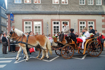 im Oktober 2013 Peters Erste Hochzeits Kutschen Fahrt Kutschenfahrten, eine "smarte" Geschäftsidee 2.0? Man nehme: Den stolzen Besitzer zweier blitzfeiner Haflinger und Kutschpferde, eine ebensolche Hochzeits Kutsche, die einmal genau für diese robusten Klein- und Gebirgspferde maßgeschneidert gebaut wurde und seit Jahrzehnten in einer Scheune auf ein zweites Leben wartet und ein Menschen Paar, das den prosaischen Termin vor einem Standesbeamten mit einem romantischen Anker vor dem schnellen Vergessen retten möchte: "Wir fahren in einer Kutsche vom Standesamt zu den Feierlichkeiten unserer Hochzeit!" Kutscher und Groom, Pferde und Kutsche als Angebot, sowie die Nachfrage nach einer Hochzeits-Kutschenfahrt kommen zueinander wie durch die Fügung einer höheren Macht. Und schon haben wir alles, was in der turbokapitalistischen Blütezeit der Menschheitsgeschichte 2.0 zu einer "smarten" Geschäftsidee werden könnte. Dass sie grundsätzlich funktioniert, bewies das "Haus U., P. & P. Preis" in Niederscheld im Oktober 2013. Ob sie auch wirtschaftlich tragfähig ist, kann nur eine sorgfältige Kosten-Nutzen-Analyse zeigen. Neben dem Besitz und Unterhalt von mindestens zwei sicheren Fahrpferden, einer präsentablen Feier Kutsche, sachkundig vertrauenswürdigem Kutscher und Groom in feierlicher Garderobe, einer guten(!) Versicherung, als Hard- und Software-Voraussetzungen, gehört dazu auch das Protokoll der Arbeiten zur Vorbereitung und Durchführung einer feierlichen Hochzeits- / Kutschen-Fahrt: