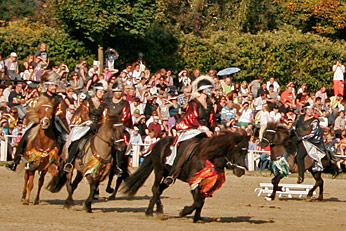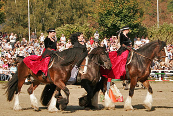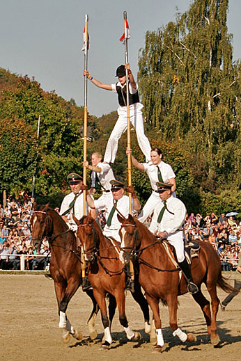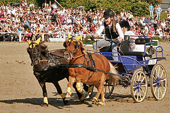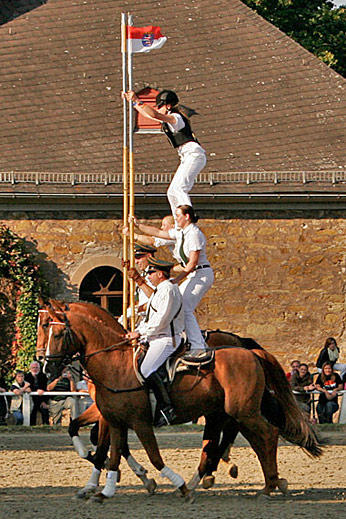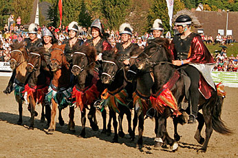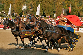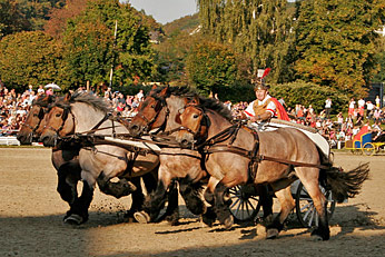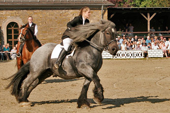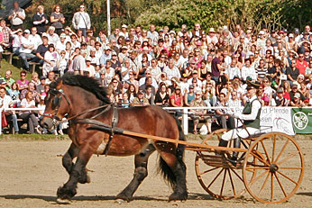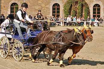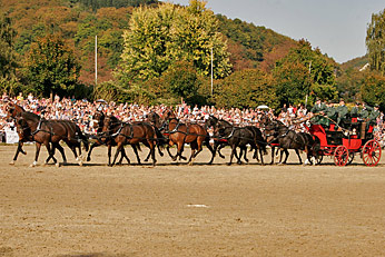 Ein wunderschöner Altweibersommer-Sonntag belohnt unseren Entschluss, erstmals die Hengstparade, eine traditionelle Veranstaltung des Landgestüts zu besuchen. Zuschauerbänke und Ehrentribüne um den Paradeplatz in Dillenburg sind schon früh fast lückenlos besetzt. Dieses „Volle Haus“ bestätigt einmal mehr, welch hohe Faszination von Pferden ausgeht. Menschen mindestens zweierlei Geschlechts und jeden Alters lassen sich von der Ausstrahlung dieser zauberhaften Wesen in den Bann schlagen. Und es sind wahrlich nicht nur „Pferdemenschen“, die tagtäglich selber mit diesen beeindruckenden Geschöpfen zu tun haben, weil sie ihnen schon längst mit Haut und Haaren „verfallen“ sind. Es sind "normale" Dillenburger und Menschen aus dem Umland, Hessen, die „ihre“ Hengstparade sehen wollen. Es sind zahlreiche Busladungen voll, und, wie die Nummernschilder verraten, viele Gäste von weit her. Nicht zu vergessen die vielen Besucher, für die das herrliche „Kaiserwetter“ den spontanen Ausschlag gegeben hat. Übrigens, eine Bezeichnung von „Blauer Himmel und Sonnenschein“, die wir dem letzten Deutschen Kaiser, Wilhelm dem II. verdanken, der sich nur bei solchen Wetterausprägungen auf Freiluftveranstaltungen sehen ließ, weil die damals noch in den Kinderschuhen steckende Technik der Photographie nur mit viel Licht kaiserlich befriedigende Ergebnisse von Ablichtungen des Astralleibes von Ihro Gnaden ermöglichte. Produkte dieser Technik von dieser Veranstaltung, die Anno 2011 in der breiten Masse nicht mehr chemisch sondern elektronisch erzeugt werden, sind hier zu sehen: Zu den Bildern. Heute ist viel Licht zwar keine Voraussetzung mehr für überhaupt ein passables Foto. Brillianz ohne Sonnenlicht ist aber auch heute schwer aufs Bild zu bringen. Die Meinung Kaiser Wilhelm II. : „Das Auto ist eine vorübergehende Erscheinung. Ich glaube an das Pferd,“ muss also "nicht um jeden Preis" als Ausdruck etwa einer generell technikfeindlichen Einstellung Ihrer Majestät herhalten, vielmehr einer hundert Jahre später mehr denn je gültigen Einsicht, dass die Reisegeschwindigkeit eines Pferde Kutsche menschengerechter ist als die einer otto-motorisierten Benzin Kutsche. Daran ändert grundsätzlich auch kein Verweis auf einen noch so zwingenden strukturellen Wandel, nicht mal auf das alles „entschuldigende“ Pass Partout Schlagwort „Globalisierung“. Nicht zuletzt, eine Veranstaltung wie diese, eines der seltenen Erlebnismöglichkeiten („Iieventz“) unserer Zeit, die mindestens drei Generationen, ohne Motivations-Verrenkungen, mit Begeisterung zusammenbringt, ist nur allzu beredte Bestätigung dafür. Aber im Ernst, auch ohne kaiserliche Fürsprache, was wir an diesem Sonntag von 13 bis17.30 Uhr, mit einer halbstündigen Pause, geboten bekommen, ist die 20 Euro (16 im Vorverkauf) jeden Cent wert. Eine kompetente, informative Ansprache durch den Leiter des Gestüts persönlich wird durch ein Heer helfender Hände nahezu pannenlos, Schlag auf Schlag, mit einer Folge von Schaubildern, Programmpunkten beliefert, die auch nicht den Hauch von Langeweile aufkommen lassen. Und diese Programmfolge lässt erahnen, welcher Umbruch hier im Gange ist. Nach Ansätzen, sich der Institution und des Kostenfaktors „Landgestüt“ in Zeiten knapper Kassen zu entledigen, scheinen Strategien zu greifen, durch Zusammenarbeit aller bundesweit 10 Haupt- und Landgestüte eine auf lange Sicht stabile Basis zu sichern und den Verantwortlichen in Verwaltung und Politik, aber viel wichtiger, den Menschen des jeweiligen Landes nicht nur die schnöde Daseinsberechtigung, vielmehr die Kultur erhaltende Notwendigkeit ihrer Landgestüte sinnfällig nahezubringen. Zu wünschen und zu hoffen wäre allerdings, dass alle Beschwörungen der großen Verdienste der vielen privaten Züchter im Lande für die Erhaltung und Pflege seltener Rassen, auch in der Praxis der Zusammenarbeit der Gestüte, z.B. von Dillenburg und Verden an der Aller, so unmissverständlich zum Tragen kämen, dass vernehmbare Befürchtungen: „Nun wird bald nur noch der ‚Hannoveraner‘ in Dillenburg übrig bleiben und der ‚Hesse‘ wird ganz verschwunden sein?!“ durch überzeugende Maßnahmen zum Erhalt lokaler Rassen, ausdrücklich auch und gerade gegen das "betriebswirtschaftliche Argument" - der Wind aus den Segeln genommen wird. Vielfalt zu erhalten ist ein Willensakt und der schönste Ausdruck der Freiheit, etwas zu unterstützen, das zum Wertvollsten gehört, das ein Mensch in seinem Leben erfahren kann. Sicherlich aber kein Bestandteil des Credos eines profitgeilen Investmentbankers. Eine weitere Neuerung, die nicht wenigen orthodoxen Anhängern des „alten“ Landgestüts Pickel verursachen mag, ist die Öffnung der Lehrgangsangebote der Hessischen Landes- Reit- und Fahrschule, die ihr Leiter, Dieter Lauterbach, vorstellt. Die Integration aller Formen der Begeisterung für das Pferd, vom wissenschaftlichen Ansatz des Erhalts der Rassenvielfalt, den verschiedenen (leistungs-)sportlichen Aktivitäten von den vielen Disziplinen des Reitens bis zum Fahren, bis zur bunten Truppe der Freizeit-Pferdemenschen, die ihre Herzen an Isländer, Lewitzer , Pintos … und die vielen „Dicken Pferde“, Kaltblüter verloren haben, ob ohne sportliche Orientierung, „einfach nur so“, oder in Verbindung mit dem Gedanken des Erhalts der Erinnerung an die Geschichte der Kultur des Pferdes als Begleiter des Menschen. Schul-Arbeitsgemeinschaften, Trainer-, Fahrabzeichen-Lehrgänge, Dressur- und Longier- Seminare, Voltigier-Ausbildung und die kleine, dafür umso begeisternde Delegation von Kaltblütern der Interessen Gemeinschaft Zugpferde (IGZ Hessen) unter Verantwortung von Stefan Schwarz für die IGZ und Dieter Lauterbach für das Landgestüt, machten mit ihren historischen Beispielen von Pferden als Nutztiere viel Spaß und mindestens so viel Vorfreude auf das "Kaltblutchampionat" der IGZ am nächsten Wochenende, 1. und 2. 10. 2011, a