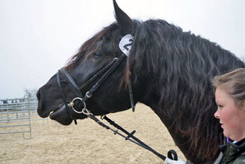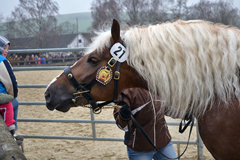 Kaltblut Hengstschau Lennestadt-Eslohe, Sonntag, 16. März 2014 Hier kann man folgende Ankündigung und mehr zur Veranstaltung im letzten Jahr lesen: Am Sonntag den 17.3.2013, Beginn 11 Uhr, findet auf der Reitanlage Schwartmecke die schon legendäre Kaltblut Hengstschau statt. Meist werden ca. 20-25 gekörte Hengste vorgestellt: Schrittrunde, Freilaufen mit Kommentierung. Der Imbissbetrieb ist stets bestens organisiert und das Essen prima. Ein Muss für jeden der sich mit Kaltblutzucht beschäftigt. Die Schwartmecke liegt im Sauerland an der B55, zwischen Lennestadt-Oedingen und -Eslohe auf einer Anhöhe. Wer sich auf den Weg macht, sollte sich sicherheitshalber hier informieren und über die Kontakt-Telefonnummer nachfragen. ... Ist das draußen? Klar ist das draußen. Temperaturen um die Null Grad sind für den Sauerländer doch schon fast Hochsommer. ... Für alle Schwartmecke-Besucher, hier eine kleine Meldung aus der Unwetterzentrale: Nordrhein-Westfalen Landkreis Hochsauerlandkreis, 59889 Eslohe; gemeldet am 17.03.2013 um 08:12 Uhr: Hier schneit es seit 6 Uhr teilweise sehr stark. Die Temperaturen liegen bei -1 Grad. Die Straßen sind teilweise spiegelglatt. ... Wir sind grade bei Olpe wieder umgedreht. Bald zehn Zentimeter Schnee und die Autobahn sch....glatt. Kann mir kaum vorstellen, dass da heute viele, noch dazu mit Hänger hinkommen. ### Samstag, 15. März 2014: Peter: Habt Ihr Lust, mit mir zur Kaltblut-Hengstschau nach Eslohe zu fahren? Es... was? Das ist im Sauerland. Hans Bollmann und Stefan Schwarz werden auch da sein. Das Wetter wird viel besser sein als im letzten Jahr. Kein Schnee, kaum Regen, kein Sonnenschein, leichter, dafür frischer Nord-West-Wind. Zieht Euch warm an. Na, dann müssen wir uns mit Frühstück und Auf-Koppel-bringen unserer beiden Lieben ja beeilen. ... Sonntag, 16. März 2014: Erstmals sogar überpünktlich, kurz vor 10(!) in Niederscheld, erreichen wir mit Peter an Utes Lenkrad gegen 11.20 Uhr den Veranstaltungsplatz des Reitvereins Schwartmecke irgendwo hinter Karl Mays Elspe, inmitten schroffer Berge des Hochsauerlandes zwischen Oedingen und Eslohe an der Bundesstraße 55. Auf dem seniorengerecht fußläufig angrenzenden Gelände mit beeindruckender Hangneigung findet Peters Benzinkutsche mit ihren zeitgemäßen Breitreifen überraschender Weise doch noch die Haftreibung für einen Stand(!)platz auf dem abgeknibbelten Rasen einer umgewidmeten Pferdekoppel. Wie das wohl im letzten Jahr bei Schneefall, s.o., ge(fl/r)utscht hat/ist? Gut verpackt nach dem Zwiebelprinzip mit fünf Schalen sollte ich die auf Dauer durchdringend zwickende Frische des Hochsauerland-Frühlings-Tages 2014 für die kommenden vier Stunden ebenso ohne Zitter-Krampf-Anfälle überstehen wie Elke unter ihrem edlen Kutschermantel. Eine überraschend große Menge von Freunden Dicker Pferde umrahmen bereits gut gelaunt und ebenfalls warm verpackt ein opulentes open air Sand-Rechteck vor einem zweistöckigen Richterturm und einer angrenzenden Wärme-, Ess-, Veranstaltungs-, Toiletten- und Verkaufshalle. Eine etwas größere Hälfte des Platzes ist Präsentationsfläche mit einem zentralen Sprecher, der über ein Kopf-Sende-Mikrofon mit der Beschallungsanlage verbunden ist. Der Rest des Sandgevierts ist Warteraum für eine Versammlung von zunächst 14 älteren, 8 bis 16-jährigen und nach deren Vorstellung 16 7-jährigen und jüngeren Kaltbluthengsten mit ihren Führstrick haltenden und oft Gerten tragenden Begleitern und -innen. Peter: Wo hast Du noch die Gelegenheit, so viele Starke Pferde-Hengste auf einmal zu sehen? In Dillenburg jedenfalls nicht. Für Elke und mich, als spätgestartete Auszubildende im vierten Lehrjahr im Fach Pferdeverstand, war dies die einmalig tolle Gelegenheit, eine derart große Versammlung von Mensch-Kaltblut-Hengst-Paaren quasi risikolos und auch noch für lau beobachten zu können. Hier ein kleiner Auszug unseres Protokolls: - Viele Gertenträger, die nach dem aktuellsten "Also sprach Zarathustra"-Äpp der Maßgabe folgen: „Wenn Du zum Hengste gehst, vergiss die Pitsche nicht“. - Führstrickträger, die mit der Gerte auf das „letzte pädagogische Argument“ verzichten (können), alldieweil ihr fortpflanzungsfähiger männlicher Begleit-Equide sogar in Gesellschaft so zahlreicher Konkurrenz von Leidensgenossen im Stand uneingeschränkten Vertrauens auf alle bauplanmäßig vorgeschriebenen Verhaltens-Hässlichkeiten verzichtet. (Weichei-Exemplare oder besonders effektiv sozialisiert / domestiziert?) - Träger des Führstricks mit "leicht" abweichender Auffassung seiner Funktion als technische Vorrichtung, die es ermöglicht bzw. erzwingt, ihrem Pferd stets gehorsam zu folgen?! Schließlich wollen Kaltblut-Hengste ja nur spielen, und so bewahrheitete sich auch heute der philosoffige Spruch, nach dem es noch immer joot jejange hätt - bis auf einen schmerzenden Ellenbogen, diverse verpflasterte Finger und ein paar verletzte Seelen. - Träger von „Sicherheits“-Schuhen der Marke Gottvertrauen aus der Abteilung Plattfuß-Hüllen. - Zur Begleitung von Pferden jeglichen Geschlechts: Nur wer wach und voll bei seinem equiden Partner ist, kann dies auch in umgekehrter Richtung erwarten! Das Tier als Spiegel des Menschen. ### In einer Nussschale, nur ein paar Bemerkungen zu dieser schönen Veranstaltung : So einfach, wie es hier gemacht wird, erlaubt es tolle Bilder der einzeln freilaufenden Hengste. So kann man sich ganz auf die Beobachtung eines Tieres konzentrieren. Hans Bollmann, der inzwischen jugendlich VIERUNDACHZIGjährige Pate der Kaltblutzucht, lässt seinen Hengst Egmont, den Vater von Peters El Paso (zwei Jahre, 700 kg), von einer starken kleinen Frau vorführen. Nach einer Verpflegungspause, die das Fassungsvermögen der warmen Halle mit Sitzgelegenheiten an ihre Grenzen bringt, folgt die zweite Abteilung „Junge Hengste“. Hier präsentiert Stefan Schwarz, unser Fahrlehrer, wie sollte es anders sein, zwei bildschöne Rappen. Seinen fü
