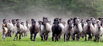 Eine "richtige" Wildnis gibt es einfach nicht mehr. Also wilder als hier geht's nicht. Im Merfelder Bruch bei Dülmen, zwischen Autobahnen, ist die einzige "Wild"-Pferde-Herde Europas zu Hause. Exzerpt eines Artikels von BIRGIT LUTZ Auf 360 Hektar Land können sich die 400 Dülmener Wildpferde bewegen. Hier werden sie gerade auf den Fotografen zugetrieben. FOTO/S: HENNING KAISER/DPA/PA Die Erde unter den Füßen beginnt zu beben. Mit jedem Meter, den das Zittern und Dröhnen näher kommt, wird man ein bisschen wacher und aufmerksamer, spitzt man gleichsam die Ohren. 400 Pferde galoppieren über eine steppenartige Wiese, Staub wirbelt auf, hüllt die Herde ein, die sich in Wellen weiterbewegt, schneller und wieder langsamer wird. Vor dem kleinen Grüppchen Menschen dreht die Herde ab, sie überrennt die Staunenden nicht, sondern baut sich vor ihnen auf, abwartend, neugierig, fluchtbereit... So beginnt ein Besuch bei den Dülmener Wildpferden, der einzigen Herde von "wilden" Pferden, die es in Europa noch gibt, mitten in Westfalen. Die Oberforstinspektorin Friederike Rövekamp ist zuständig für die Wildpferdeherde. Sie kennt die Tiere und den immanenten Widerspruch "wilde Tierhaltung". Zwei bis vier Besuchergruppen täglich erklärt sie, warum es im Merfelder Bruch, einem Moorgebiet, heute Wildpferde gibt. Weil hier schon vor etwa tausend Jahren eine ganze Reihe dieser Herden lebten, die gemeinsam von Bauern genutzt wurden - als Fleischlieferanten. Die Bauern kreuzten im Lauf der Zeit Hauspferde in die Herden ein, um die Tiere dicker und den Fleischertrag größer zu machen. Die Pferde vermehrten sich und entwickelten sich vom Segen zur Plage: Sie fraßen den Bauern die Ernten weg. Worauf der Mensch die Pferde zu jagen begann, bis sie nahezu ausgerottet waren. Alle, bis auf die Herde im Merfelder Bruch: "Die hat man vergessen. Wegen des hohen Grundwasserspiegels wurde hier wenig Ackerbau betrieben. Daher störten sie die Menschen nicht so." Mitte des 19. Jahrhunderts errichtete der Herzog von Croÿ, dem das Gelände gehörte, auf das sich die Tiere zurückgezogen hatten, ein Reservat. Er zog einen Zaun um die Herde herum, 400 Tiere auf rund 360 Hektar Land. Seitdem geht es hier um die Frage, ob die Dülmener Wildpferde noch "wild" sind und ob überhaupt noch ein Tier "wild" sein kann in unserer vom Menschen dominierten Welt. Des Öfteren schneiden Leute, die sich "Sorgen um die Tiere" machen, Löcher in die Zäune und hängen Schilder auf: "Freiheit für die Wildpferde". Eine Auffassung von Freiheit, mit der sie den Wildpferden zwischen zwei Autobahnen allerdings ernste Sorgen bereiten. Nur, einen Gefallen tun sie ihnen damit nicht. Trotz einstiger Einkreuzungen mit Hauspferden ähneln die Dülmener Wildpferde noch immer dem Tarpan, einem Urpferd, das seit dem Zweiten Weltkrieg im polnischen Masuren wieder rückgezüchtet wurde. Die Dülmener Herde besteht aus Stuten und Fohlen - und die Stuten werden nun jährlich von einem der Hengste aus Masuren gedeckt, damit dieses Erbmaterial erhalten bleibt. "Wir versuchen, die Lebensbedingungen der Pferde so weit es geht so zu gestalten, als würden sie wild leben", sagt Rövekamp. Das bedeutet zum Beispiel: Es kommt kein Tierarzt. "Ein Entwurmungsversuch hat vor einigen Jahren etlichen Tieren das Leben gekostet. Also lassen wir das bleiben". Im Anschluss beobachteten sie, dass die Pferde ihre eigene Wurmkur machen: Sie gehen in den Wald und fressen Baumrinde - darin sind Gerb- und Bitterstoffe enthalten. "Ein wildes Pferd "weiß" so etwas. Deshalb ist es wichtig, alte Rassen zu erhalten. Diese Pferde sind robust, kompetent und an den Lebensraum angepasst - sie brauchen keinen Menschen." Manche Eingriffe dagegen müssten sein. "Man kann Tiere nicht erst einzäunen und dann sich selbst überlassen. Das wäre grausam." Im Reservat fehlen "natürliche" Feinde, Fressfeinde, die sich schwache Tiere aus der Herde holen könnten. "Wir leisten deshalb Sterbehilfe und erlösen altersschwache Pferde. In der "Wildnis" würden dies Wölfe oder Bären tun." Und, weil die Tiere ihrer Nahrung nicht hinterherwandern können, wird im Winter Heu zugefüttert. Dabei werde stets versucht, die Tiere so wenig wie möglich an menschliche Präsenz zu gewöhnen und ihr natürliches Verhalten nicht zu beeinflussen. Umso größer muss der Stress beim jährlichen traditionellen Wildpferdefang sein. Ein Ereignis zu dem rund 15.000 Besucher zu Bratwurst, Musik, und viel lautem Gedöns auf das Gelände strömen. "Die Jährlingshengste müssen gefangen werden", sagt Rövekamp, "weil sie sonst versuchen würden, eigene Herden zu bilden." Die Tiere würden sich so stark vermehren, dass sie bald zu viele für das Areal wären. Es käme zu gefährlichen Rivalenkämpfen. Die Herde wird in eine mit Zuschauern besetzte Arena getrieben, wo die Jungshengste von Fängern per Hand eingefangen, aufgehalftert und von der Herde getrennt werden. "Selbstverständlich gibt es schönere Tage im Leben der Pferde. Andererseits folgen auf diesen einen Tag dann wieder 364 andere, an denen die Tiere ihre Ruhe haben." Und nicht zuletzt sei dies der einzige Tag, an dem mit der Herde Geld eingenommen werden könne. Denn die Hengste werden im Anschluss versteigert - um die 400 Euro werden für eins der begehrten Dülmener Pferde bezahlt. Im vergangenen Jahr hat eine aufgeregte Stute einem Fohlen gegen den Kopf getreten und es dadurch getötet. Der obligate Rundum-Protest von Tierschützern löste fast das Ende des Junghengstefangs und damit der ganzen Herde aus. Um den Stress für die Tiere zu minimieren, werden heute Familienverbände ohne einen Junghengst gar nicht erst ins Stadion getrieben (wozu auch?), und die Fänger werden geschult, behutsamer vorzugehen und sich das "natürliche Verhalten" (welches, wie?) der Tiere beim Fang zunutze zu machen. Albert Huesmann ist einer der Fänger. Der 46-jährige Landwirt ist seit 27 Jahren beim Fang dabei, wie schon sein Vater vor ihm. "Man kann die Hengste nic