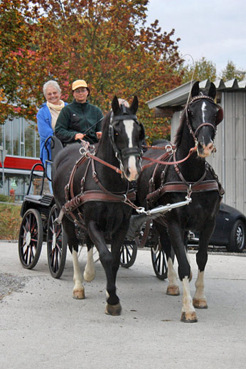 DIE Kutschfahrt #1 Mittwoch, 5. Oktober 2011 Silvia Hagemeyers Kommentar auf unsere Vollzugsmeldung von Montag: „Toll, Ihr habt viel Mut gehabt,“ und was „Voll-Gas-Jaron“ betrifft: „Jaron sollte vor der Fahrt longiert werden, Jankid nicht“. Silvia kann am Mittwoch spätestens gegen 17 Uhr in Breitscheid sein. Ursprünglich wollte sie Gerlinde Müller mitbringen; Gerlinde kann diese Woche aber nicht. Silvia: „Ich bin Einer-Fahrerin, Gerlinde ist Fachfrau für Zweiergespanne. Wir versuchen es halt mal ohne sie und schauen, wie weit wir kommen.“ Elke und ich holen Jaron und Jankid um 15 Uhr von der Weide und longieren Jaron. Kurz darauf erscheint schon das Haus Hagemeyer in Gestalt von Silvia und Gaby. Silvia übernimmt das weitere Longieren von Jaron, mit der Anweisung: "Kein Galopp, nur Schritt rechts herum und viele Übergänge von Schritt auf Trab und umgekehrt." Aha. Von weiteren Überraschungen bis Erleuchtungen: Aufschirren • Silvia hat einen kompletten Fahrzaum für Jaron dabei, der bei der Fahrt dann auch gut funktionieren wird. Für uns war das aber null erleuchtend. Wir werden weiter mit dem Zaum fahren (müssen), der zum braunen Brustblatt-Geschirr gehört und dessen Kandarenstange in unseren Augen zu kurz ist. Nach wie vor wissen wir nicht, welches Kandaren-Stangen-Maß für Jaron das passende ist?! • Die Brustblätter haben wir falsch zugeordnet, müssen getauscht werden. • Jankid muss näher an die Kutsche heran, damit er zu mehr Zugleistung animiert wird. Also sind seine Zugstränge um wenigstens ein Loch verkürzt zu verschnallen. Die Konsequenzen für die entsprechend korrekte Leinen-Ausgleichs-verschnallung warten auf die Expertise von Gerlinde Müller. • Die Stranghalter bleiben im Schrank. • Die Zugstrangverschnallung allgemein muss korrigiert werden. Die Adapter von Zugsträngen zu den Sicherheitsverschlüssen an den Ortscheiten werden „richtig“=? eingesetzt. Anspannen • Jankid, als das größere Pferd, geht immer links, der kleinere Jaron rechts. Aha. Nachdem alles zur Zufriedenheit von Silvia war, sie die Leinen aufgenommen, Gabi als Grand Dame ihren Platz auf der Kutsche eingenommen, ich als rekonvaleszenter Sommergrippe-Patient den Platz neben dem Bock erklommen hatte, fiel schließlich nach kurzer Erörterung verschiedener Möglichkeiten die Entscheidung für die von Jutta vorgeschlagene Strecke zum Parkplatz an der Straße von Breitscheid nach Langenaubach und zurück, und Elke gab als Groom den Platz vor den Pferden frei, enterte die Kutsche, und es ging los. Vom Saalbach-Hof aus geht’s für Jaron und Jankid ihren gewohnten täglichen Weg zur Weide. Nur kurz auf der Medenbacher Straße nach rechts, dann durch das Gelände der Firma Georg links ab und bergauf. Vor deren Mitarbeiter Parkplatz links, wieder ebenerdig bis zum Küchenstudio Deisel und hier, an der Dachdeckerei Thielmann nach rechts, bergauf, über das ehemalige Gleisbett der Bundesbahn, am ehemaligen Bahnhof und dem anschließenden Holz-Leisten-Werk der Firma Becker & Jahn vorbei. Schließlich lassen die beiden den Eingang ihrer Weide für die letzten vier Monate rechts liegen und folgen dem weiter steigenden Weg. Oberhalb ihrer Weide, am Wertstoffhof der Gemeinde vorbei, geht es mehr oder weniger ebenerdig weiter. Zunächst noch asphaltiert, später geschottert, vorbei an idyllisch gelegenen Weiden und durch lichten Laub-Mischwald. Eine sehr schöne Strecke von insgesamt knapp fünf Kilometern. Doch, um endlich zur Antwort auf die spannende Frage zu kommen: Hat Silvia den „ersten Gang“ von Jaron gefunden? Ganz schlicht und unaufgeregt: Ja. Von den ersten Schritten auf dem Saalbach-Hof an war Silvia in pausenlosem akustischen „BRRT“-Kontakt mit den Ohren von Jankid, aber vor allem mit denen von Jaron. Obwohl Jaron vor der Fahrt longiert wurde, zeigte er im Vergleich zum Montag, ohne erkennbaren Einfluss von Dritten, erneut von Anfang an den gleichen, vielleicht ein klein wenig gedrosselten Arbeitseifer. Der ist damit wohl Bestandteil seiner Persönlichkeit als ganz besonderes (Sport) Kutschpferd. Was für Jaron beim Gas wegnehmen gilt, trifft auf Jankid für das Gas geben zu. Er reagiert deutlich und willig auf Peitschenberührungen („Hilfen“) auf der Pobacke. Was ich nicht herausfinden konnte, war die präzise Dynamik des Leineneinsatzes von Silvia. Ein Thema für eine nächste Fragestunde bei der Meisterin. Gabi und Silvia Hagemeyer, Jankid und Jaron Jutta empfängt uns mit zwei Blitzbildern und nach dem Abspannen, Ausschirren, Abkühlen unserer beiden Gladiatoren auf vier Beinen gab‘s deren verdientes Abendbrot. Von links: Jaron, Gabi und Silvia Hagemeyer, Ein ganz großes Dankeschön an Silvia und das Haus Hagemeyer für diese erste „gesittete Kutschfahrt“ mit Jaron und Jankid. Vielleicht gelingt ja doch noch ein Termin mit der Zweiergespann-Fachfrau Gerlinde Müller. Das wäre natürlich ein traumhafter Start in unsere Senioren-Kutschfahr-Karriere. Karlheinz |