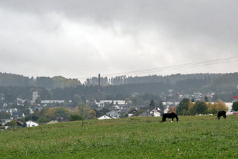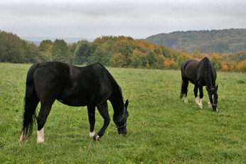 Eine neue Weide für Jaron & Jankid Vom 1. Juni bis 19. Oktober war das Weidedreieck zwischen Erlen- und Siegweg am Nordrand von Breitscheid für Jaron und Jankid das erste Tageslicht-Zuhause im Hohen Westerwald. Der halbe Hektar, mit einigen Obstbäumen, einem kleinen Wäldchen am Nordrand und einer Baumreihe nach Osten, bot den beiden an Witterungs-Schutz und Grasfläche alles was das Pferdeherz begehrt. Die Grasnarbe war aber dann doch, nach fast fünf Monaten, einigermaßen bodennah abgeknibbelt. Selbst die "Klo"-Flächen kamen schon unter den Rupf-Hammer. Ein Wechsel auf ein neues Gras-Biotop war also durchaus angesagt - so üppig wächst es im Oktober halt nicht mehr. Obwohl bei beiden von drohender Abmagerung weit und breit keine Rede sein konnte - Winterspeck Gewinnerwartung war eher angesagt. Zu erreichen ist die neue Weide auf einem sogar nur ca. 400 m langen Wirtschaftsweg unterhalb des Reitplatzes, kurz vor dem Steinbruch, dessen Rand den allerdings leider einzigen Wetterschutz und nur in Richtung Osten gewährt. Da die neue Weide aber nach Norden an die Medenbacher Straße grenzt und westlich an die Stuten- und Fohlenweide des Saalbachhofs, war für unsere Beiden nach fünf Monaten altersgerecht reizarmem Schon- und Gewöhnungs-Programm nun Desensibilisierung gegen Verkehrslärm (eine Kern-Kompetenz für Kutschpferde) und Gewöhnung an jede Menge sozialer Schnuten- und Wieher-Kontakte angesagt. Fehlender Witterungs- vor allem Wind-Schutz nach Norden, Westen und Süden erzwang denn trotz eines herausragend milden Verlaufs des Herbstes und beginnenden Winters schon mal ein paar Tage in der Box ohne Weidegang. So wie es im Winter wohl häufiger angesagt sein wird. Aber, wie schon der Vielosoffie-Professor Sir Michael Philip Jagger sagte: "You can't always get what you want..." auch dann nicht, wenn Du ein noch so liebes Kutschpferd aus Gelderland bist.