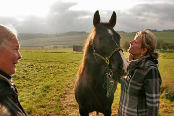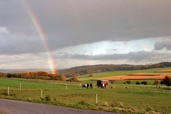 Curly & Sahrib mit Maja & Nadja auf dem Saalbach-Hof Am selben Tag an dem Jaron und Jankid auf eine neue Weide kamen, traten die vierjährige Quarterhorse-Stute Curly und der 15jährige Araber-Wallach Sahrib mit ihren Menschen Maja und Nadja ihr Pensionat bei Jutta und Werner auf dem Saalbachhof an. Elke, Curly und Maja 50 m unterhalb des Reitplatzes grasen sie nun auf einer 0,84 Hektar große Koppel mit Weidehütte, die vor allem gegen die Hauptwetterlagen mit West- aber auch Nordwest- und Südwestwind Schutz bietet. Im Ex-Rinderstall des Hofes stehen sie in "Schlaf"-Boxen, für den Fall, dass ihnen die Nacht im Freien einmal nicht zuzumuten sein sollte. An den rauen Hohen Westerwald muss sich auch "pferd" erst einmal gewöhnen. Die Weide von Curly und Sahrib vor dem Regenbogen Besonders für die regelmäßigen "Kunden" des "Café Saalbach", vor allem in den morgendlichen Pausen zwischen erster und zweiter Boxen-Pflege-Einheit, bringt dieser personelle Zugang auch noch lukullische Bereicherungen mit sich. Majas feine Tee-Sorten veredeln das Getränke-Angebot, und ganz besonders ein Produkt der Backleidenschaft ihres Sohnes befördert fortan die Hof-Chefin in den "Siebten-Kokos-Raspel-Plätzchen-Himmel"; Jutta: "Dafür müsste es einen Verdienstorden geben!". Zu den Bildern.