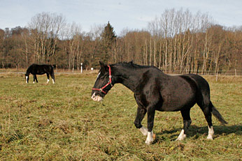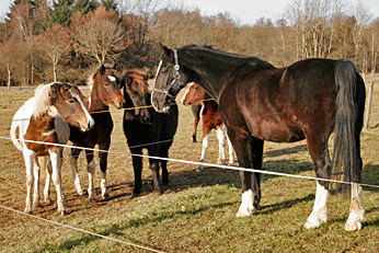 Wer hätte das gedacht, 30. Oktober - den größten Teil ihrer Blätter haben die meisten verholzenden Pflanzen (Bäume und Sträucher), ohne Eile über Wochen verteilt, in üppigem Farben-Rausch abgeworfen - und: Die Sonne lacht immer noch so herrlich über dem Westerwald. Jaron und Jankid vor blattlosen Bäumen Aber für dieses eigenwillige Jahr 2011 war das wohl nur die Fortsetzung einer ganzen Reihe von Witterungs-Capriolen. Erst ein Frühling, der Sommer "spielt", dann ein Sommer, der keiner war und nun ein Herbst, der wohl die Fortsetzung des Sommer-Frühlings sein wollte. Für unsere Beiden, Jaron und Jankid, ein Glück. Viele Tage Bewegung auf der Koppel. Und dennoch, bei frischen Nachttemperaturen des Hohen-Westerwald-Klimas wächst ihnen beiden ein üppiges Winterfell. Ganz besonders aber dem "Schäfchen" Jaron. Saalbachs Lewitzer-Stuten mit ihren Fohlen, fasziniert vom "Alten Mann" Jaron und der vom "Jungen Gemüse" Übrigens: Bei bestimmten Beleuchtungswinkeln changiert das Fell beider Rappen ins jahreszeitlich korrekte Rötliche - sehr schön. Zu den Bildern.