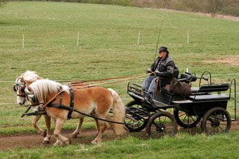 Unsere Kutschfahrt #1 mit Peter & Warino + Nando Karfreitag, 6. April 2012 Für der Geduld Ermangelnde geht's hier schonmal: Peters Einladung stand schon länger undatiert "im Raum". Nun kam sie da heraus: Karfreitag, 14 Uhr, sollte es losgehen - und "pünktlich" um ca. 14.30 Uhr melden wir uns denn auch zur Stelle, am traumhaft schön gelegenen Stall von Peter und Andreas in Niederscheld. Die Hauptakteure stehen bereit: - Warino und Nando, die beiden Haflinger Wallache, das Gespann von Peter vor seiner zweispännigen Wagonette, - Eiko, der Rheinisch Deutsche Wallach vor der einspännigen Wagonette von Andreas und - Nanncy, die Friesenstute, geritten von Marina. Aufschirren, Anspannen und Satteln geschehen in ruhiger Athmosphäre, und gegen 15 Uhr nehmen die beiden Kutscher, Peter und Andreas, ihren jeweiligen Bock und Marina ihren Seit-Spagat-Sitz ein (pardon, ist aber auf einem Pferd dieser Abmessungen nicht anders drin, öh, drauf). Wir finden Platz auf Peters Wagonette, und bei schönstem Sonnenschein geht es zunächst, die Pferde schonend, durch Wohnbebauung über öffentliche Straßen hinab ins Tal der Schelde. Nach rechts, und da, wo die Namensgeberin von Ort und Tal in die Dill mündet, geht es über die Dill-Brücke, unter der Eisenbahnlinie und der Schnellstraße nach Dillenburg hindurch, links ab ins Lützelbachtal. Der Weg zieht sich, beständig steigend unter der Autobahnbrücke hindurch und von nun an ununterbrochen durch alten Mischwald Richtung Westen. Bis zum Niederschelder Fußballplatz und den Ruinen des Kriegsgefangenen-Lagers fahren beide Wagonetten und die nach hinten "absichernde" Reiterin im Konvoi. Nun lassen es Eiko vor Andreas und Nanncy unter Marina etwas ruhiger angehen, und die beiden bestens trainierten Jung Spunde von Peter geben Gas. Bald ist auch auf langen Serpentinen kein Blickkontakt mehr möglich. In einem großen Rechts-Bogen geht es durch den Dillenburger Forst, in dem diesen/s Winter/Frühjahr ausgiebig Buchen geerntet wurden. Als Peters Leistungssportler-Gespann sich erneut der Autobahn- Talbrücke über den Lützelbach nähert, meldet sich Andreas per Händie: "Wo bleibt ihr? Wir sind schon hinter der Brücke!" Das ist doch wohl nicht so ein Hase-Igel-Ding, oder? Haben die etwa abgekürzt? Wahre Sportsmänner, wie Warino, Nando und Peter nehmen solch eine "Niederlage" milde lächelnd mit Anstand und der Gewissheit, dass es keine Schande ist, sich an die selbst gemachten Spielregeln zu halten, auch wenn man dann "nur zweiter bis dritter Sieger wird". In einem kleinen Endspurt geht es nun, wieder im Konvoi, hinauf zu den Ställen. Diesmal "gewinnen wir": Peter & Warino + Nando. Abspannen, Ausschirren, Absatteln, Pferde versorgen.... Danke! Für eine schöne Fahrt. Elke und Karlheinz ....hier nun für alle, die gewartet haben, noch einmal, zu den Bildern. Hier waren wir übrigens unterwegs: |