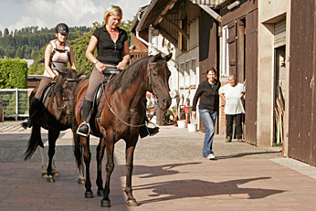 Maya reitet wieder Nach achtzehn Monaten Abstinenz, die eine Achillessehne und ein Knie ihr verordnet haben, war es das sonnige Gesicht des zweiten Freitags im August 2012, das Maya Mut machte, erstmals wieder da hin zu steigen, wo nach Friedrich von Bodenstedt das Paradies der Erde liegt: Auf den Rücken eines Pferdes. Wenn übrigens in der Fortsetzung dieses Zitats eines allseits unbekannten Dichters ein weiterer Teil des Paradieses in der Gesundheit des Leibes liege, dann wird allerdings deutlich, dass Reiten, traditionell auf diesem Körperteil des großen Landsäugers, Fried- und Fluchttieres ausgeübt, unmittelbar an einen paradiesischen Konflikt grenzt. Jedes Kind weiß schließlich, wie leicht ein Sturz von dort auf den Boden der Landschaft die Gesundheit empfindlich stören kann. Da das Scheuen von Risiken aller Art nicht zu Mayas Stärken gehört und da Frauen ja bekanntlich den dritten Teil des Paradieses, der nach Bodenstedt „am Herzen des Weibes“ liege, von Natur aus, sui generis besitzen, wunderte es zu mindestens mich nicht, dass sie - halbwegs schmerzfrei - gemeinsam mit Sarah zur reitenden Tat schritt. Sarah harmoniert unverändert und glücklich mit Soe, und nach kurzer aber notwendiger Klärung der Hierachie mit Sahrib... ...reitet Maya wieder. Die Bilder zeigen die Vier am Start zu dieser Unternehmung und die Zwei nach der Rückkehr davon, mit den drei Teilen des Bodenstedtschen Paradieses: Ein sturzfreier Ritt, im Besitz ihrer Gesundheit, und eine dringende Aufgabe für die Männergleichstellung mit ihren "frei Haus" Glück bringenden „Weiber-Herzen“. |