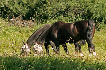 Weide #4 / 2012 9. September 2012 Immerhin neun Wochen haben unsere Beiden gebraucht, um ca. 0,4 ha bis auf die Grasnarbe abzuknibbeln. Nun war zwar die Gesamtmenge an grüner Füllung ihrer Verdauungs Apparate über 24 Stunden auf einem wünschenswert niedrigen Niveau. Aber gleichzeit stieg der Anteil der gerade jetzt nachgewachsenen Grasspitzen, die offenbar die Stoffe (Zucker) in hohen Mengen enthalten, die für Pferde nicht gerade gesund sind. So erhielten Jaron und Jankid in diesem Sommer zum vierten Mal den Marschbefehl von Jutta und Werner. Diesmal ging es zurück auf ihre aller erste Weide in Breitscheid, das Dreieck zwischen Sieg- und Erlenweg. Um zumindestens für die erste Zeit einer Überfüllung der Grasmägen vorzubeugen, holen wir sie abends in den Stall. Dort geben wir ihnen noch eine kleine Netzfüllung Heu als Beschäftigung bis zum Einschlafen. Zu ein paar großen Bildern. zurück zu: Pferde |