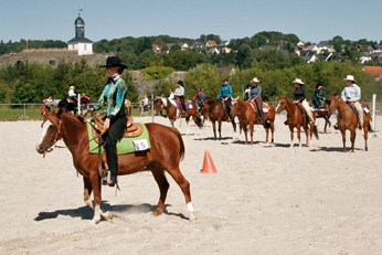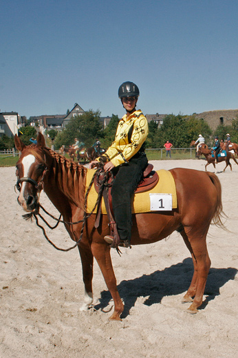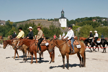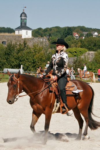 Beim Trail werden Geschicklichkeits Aufgaben gefordert, wie z.B. ohne Absitzen durch Weidetore zu gehen, was kontrollierte, exakte Bewegung des Pferdes in alle Richtungen erfordert (Rückwärtsrichten, Seitgänge), oder überqueren von Holzbrücken, wobei Gelassenheit und Vertrauen des Pferdes zum Reiter sichtbar werden. Es werden alle möglichen und unmöglichen Situationen simuliert, die einem Reiter im Gelände (auf einem Trail = Wanderritt) begegnen können. Hierbei ist es wichtig, dass sich das Pferd ruhig, selbstständig und geschmeidig, ohne große Einwirkungen des Reiters, durch die Hindernisse bewegt, sich aber trotzdem jederzeit zentimetergenau dirigieren lässt. Die Prüfung besteht meist aus sechs Hindernissen. Immer dabei ist das Tor, ein Überreiten von mindestens vier Stangen (im Schritt, Trab oder Galopp, auf gerader oder gebogener Linie) und ein Hindernis, das rückwärts zu durchreiten ist (L, U oder ähnliches). Die Abstände der Stangen oder der Hindernisse zueinander sind reglementiert. Die Gangart zwischen den Hindernissen ist ebenfalls vorgegeben. Die Wertung beginnt wie bei der Reining bei 70 Punkten. Davon zieht man Fehlerpunkte ab, z.B. fürs Anschlagen an Stangen. Auch die Manier des Pferdes am Hindernis (Ruhe, Kopfhaltung, Aufmerksamkeit) fließt in die Bewertung ein. ### Der Wettkampf heute ist ausgeschrieben für Einsteiger, Freizeitreiter und "offen", also für alle anderen, vom Fortgeschrittenen bis zum Trainer und sonstige Profis, wenn ich das richtig verstehe. Gemeldet wurden 23 Pferde und 27 Reiter/innen. Darunter fast ein Viertel Reiter, immerhin sechs Cowboys. Bravo Jungs Weiter so! Das sage ich euch, denn schon das Zuschauen machte Spaß. Über die sportliche Qualität der heute gebotenen Leistungen kann ich natürlich nicht die Bohne sagen. Die Zahl der Zuschauer, die nicht zum familiären und sonstigem Anhang der Wettkämpfer zählten, kann sich ganz bestimmt mit der bei den Fahrertagen messen. Dennoch, die Außenwirkung der Vereinsaktivitäten bleibt weiterhin eine dankbar zu bearbeitende Baustelle für Phantasie begabte Sozial-Technik-Designer der modernen Mediengesellschaft. Ein Nachmittag als Helfer von Elke an der „Bar“ bescherte mir im Kaffee- und Kuchen-Container gar nicht mal den übelsten Platz. Immerhin brachte ein wahrhafter Sommertag im Frühherbst 2012 noch einmal schweißtreibende Sonnen Stunden für alle, die "open air" und ohne Schattenspender agieren durften oder mussten. Wenn man also schon mit dem Wetter so viel Glück hat, dann kommt halt auch noch kein Pech dazu. Die Veranstaltung verlief ohne geringstes, mir zu Ohren gekommenes Malheur. Ich kann mich nur an fröhliche Gesichter erinnern. Also, bis zum nächstes Mal: Westernreiten im Westerwald! Meinetwegen ganz ohne Lokalpatriotismus. Karlheinz À propos Riders ... |