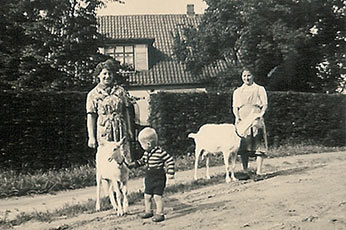 Eine Lotte Weide war hier. Hierhin führten wir häufig unsere Ziegen, die alle Lotte hießen, um sie dort am späten Nachmittag oder abends satt zu hüten. Das war dann erreicht, wenn die kleinen Kuhlen zwischen den nach oben herausragenden Beckenknochen und der Bauchrundung nicht mehr zu sehen waren. So lautete Vatels undiskutierbare Definition einer satten Ziege. Wer diese sympathischen, erfrischend sprunghaften Geschöpfe kennt, der weiß, wie aufregend ihre beständig wechselnden Appetit-Vorlieben sein können. Entsprechend zickig verliefen viele dieser Hüte-Episoden mit nicht selten "weißglühenden" Hütejungen am Ende. Dafür spendeten alle diese nervigen Lotten, diese weißen, bärtigen, kurzschwänzigen, neugierigen und intelligenten Milchmaschinen ihren beiden Hütejungen über die Jahre tausende Füllungen der Kanne, die, am Ende der Treppe zur Wohnung im ersten Stock bei Schmidts, jederzeit auf sie wartete, wenn ein kleiner Durst zu stillen war. Muttel und ihre Schwester, Tante Rosel, mit Sohn Ludwig und zweimal Lotte vor Schmidts Haus. Danke, Ihr lieben Lottes, für eine Ziegenmilch und nicht Zuckerwasser getränkte Kindheit in Eschenhausen! nach oben weiter zu: 14 - Kallemanns Tommy-Wald |