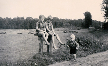 14 Zu gewissen Zeiten wurden unsere Ziegen Lotte auch tagsüber an den damals noch breiten, unbewirtschafteten Streifen zwischen Wegen und Äckern geweidet. Eine besonders häufig genutzte Ziegenweide war am Weg, der rechts ab vom Tommy-Wald Richtung Schröder führte. Mittels Halsband und einer Leine am Ring eines Eisenpflocks im Boden „stationiert“, fraßen die Lottes in kürzester Zeit einen schönen Kreis ratzekahl, so dass sie dann umgepflockt werden mussten. K! Dieser Teil des Weges gehört zu Osterbinde. Interessant und passend dazu ist vielleicht ein Auszug aus dem Protokollbuch des Gemeinderats Eschenhausen vom 2. Februar 1949: „Für die bisher unentgeltlich überlassene Grasnutzung auf den Wegen auf dem Eschenhauser Felde sollen die Mieter in Zukunft bezahlen.“ Im Vordergrund: Reinhard, Karlheinz auf, Ludwig Hoegen vor dem Milchbock. Im Mittelgrund: Ein fast abgeerntetes Haferfeld. Im Hintergrund: Kallemanns Tommy-Wald. Im Rahmen solcher Hüte- oder Um-pflock-aktionen erinnere ich dunkel, dafür um so unbeirrbarer, dass der angrenzende Wald einmal das Manöver-Biwak britischer Soldaten war. Eschenhausen lag nach dem Zweiten Weltkrieg in der Britischen Besatzungszone. Konkrete Aktionen der Tommys, Spitzname für britische Soldaten, sind mir nicht in Erinnerung. Wohl aber Tarnzelte, Fahrzeuge, alle in Tommy-Grün, Donnerbalken-Toiletten mit rechteckigen Erdaushüben da-ru/hi-nter und vor allem ein ganz charakteristischer Geruch, den ich seitdem mit „meinem“ Tommywald verbinde. Dass ich diesen Odeur bei meinem Besuch 2009 nicht wiederfinden konnte, mag natürlich an der altersbedingt fortschreitenden Dienstverweigerung meines Riechkolbens liegen. Andererseits sind große östliche Teile dieses Waldes gerodet und heute Ackerfläche. Cheers! Was ich auch nicht wiedergefunden habe, ist ein Baum, der alle übrigen im westlichen Teil des Tommy-Waldes vor mehr als fünfzig Jahren überragte. Den erkletterten Reinhard und Kallemann einmal gegen Abend und ließen sich in seinen höchsten Zweigen von einem verschwenderisch grandiosen Schauspiel eines Sonneuntergangs in Richtung Bassum derart gefangen nehmen, dass sie die ultimative Ansage des Vatels total vergaßen, auf jeden Fall vor dem Dunkelwerden zuhause zu sein. Als uns dies im letzten Glühen des westlichen Himmels ebenso heiß wieder einfiel und wir in Windeseile vom Baum geklettert waren, standen wir auch schon im stocke düsteren Wald. Dass der Vatel, der uns entgegen gekommen war, den Kallemann nach dem Verlassen des Waldes einer deftigen Züchtigung unterzogen hat, „weiß“ ich erst viel später wieder aus den Erinnerungen Reinhards. Für mich zählt auch neute nur dieser atemberaubende Plumps der Sonne über den Rand der Erde. Über alles andere werfe ich meinen Hut. nach oben weiter zu: 15 - Lindloges Hof |