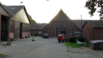 17 Vom "Geheimnisvollen Haus" nur ein paar Meter weiter die Dorfstraße entlang, liegt auf der rechten Seite ein gut erhaltenes, im Jahr 1843 erbautes Hofgebäude, Eschenhausen 15. K! Noch mit den traditionellen, gekreuzten hölzernen Pferdeköpfen am ebenso traditionellen Schopf- oder Krüppel-Walmdach-Giebel.